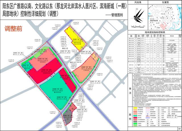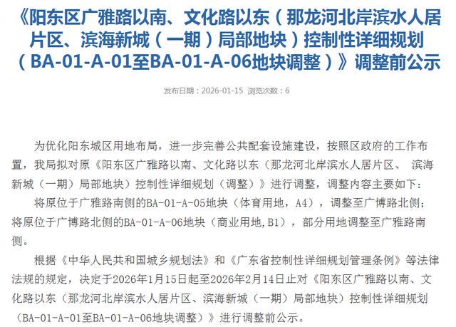 1月15日,阳东区广雅路以南、文化路以东(那龙河北岸滨水人居片区、滨海新城(一期)局部地块)控规(BA-01-A-01至BA-01-A-06地块调整)调整前公示,将原位于广雅路南侧的BA-01-A-05地块(体育用地,A4),调整至广博路北侧;将原位于广博路北侧的BA-01-A-06地块(商业用地,B1),部分用地调整至广雅路南侧。