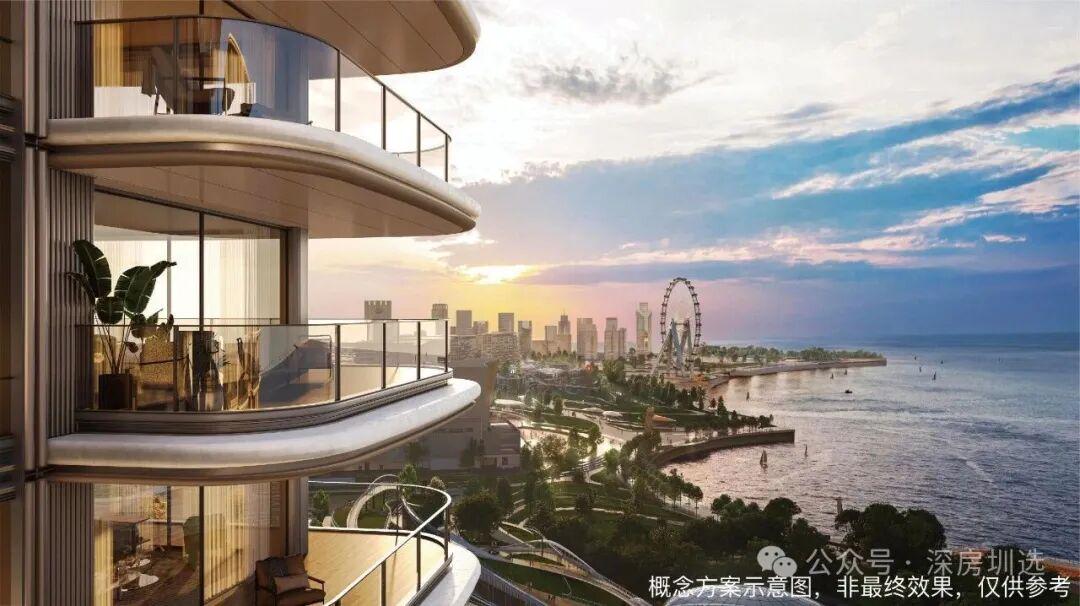 项目东南面正对欢乐港湾的“湾区之光”摩天轮和“湾区之眼”文化综合体,西侧与腾讯企鹅岛隔海相望。
