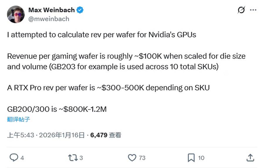 分析师Max Weinbach表示,从晶圆收益来看,英伟达不同用途GPU的盈利差距极为显著:每片用于生产GeForce游戏显卡GPU的晶圆收益约为10万美元,RTX PRO专业显卡晶圆每片收益30至40万美元,而用于AI及HPC的GB200/GB300 GPU晶圆收益则高达80至120万美元。巨大的收益差距或成为英伟达调整供应策略的重要原因。