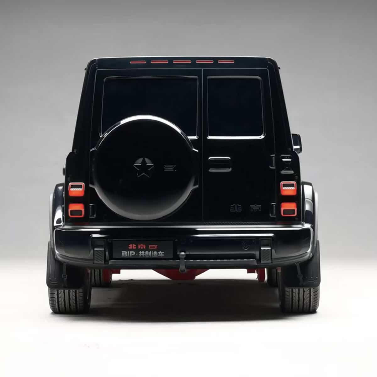 再来看车尾部分,车尾同样采用方盒子造型设计,后备厢采用双开门结构,方便大件物品装载。传统备胎被创新升级为可储物“小书包”,继承概念车广受好评的物资储备设计,为北京81增添灵活的战术机能。泄压阀位置的科学调整实现安全与空间的智慧平衡,大幅提升电池安全防护等级,同时优化车内空间利用率。车尾设计体现了实用主义思路,外挂式备胎采用侧移式支架,不影响尾门开启。