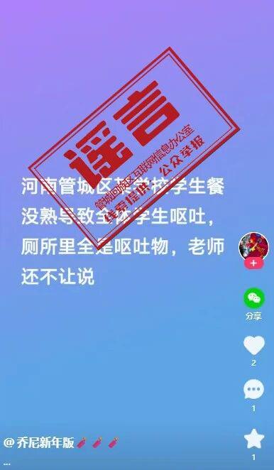郑州市网信部门通报称,网络账号“乔尼新年版”发布信息称,“河南管城区某学校学生餐没熟导致全体学生呕吐。”经管城回族区教育局、市场监管局等相关部门核实,该学校并未发生所述问题。目前,管城回族区网信、公安部门已对发布该信息的相关责任人进行了批评教育,相关信息已删除。
