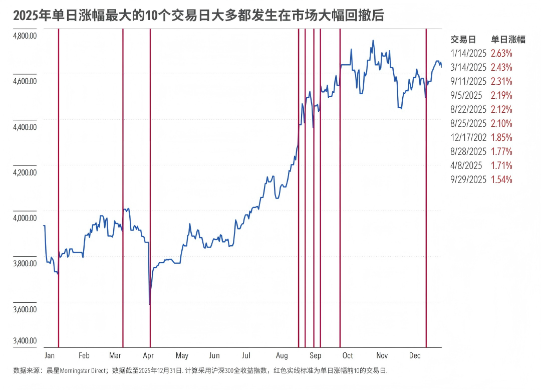 值得注意的是,这些涨幅最大的交易日,大多出现在市场刚刚砸出一个“深坑”之后。这也意味着,如果在看到大跌之后,出于避险而短期离场,往往会直接错过全年最大的几个涨幅日。