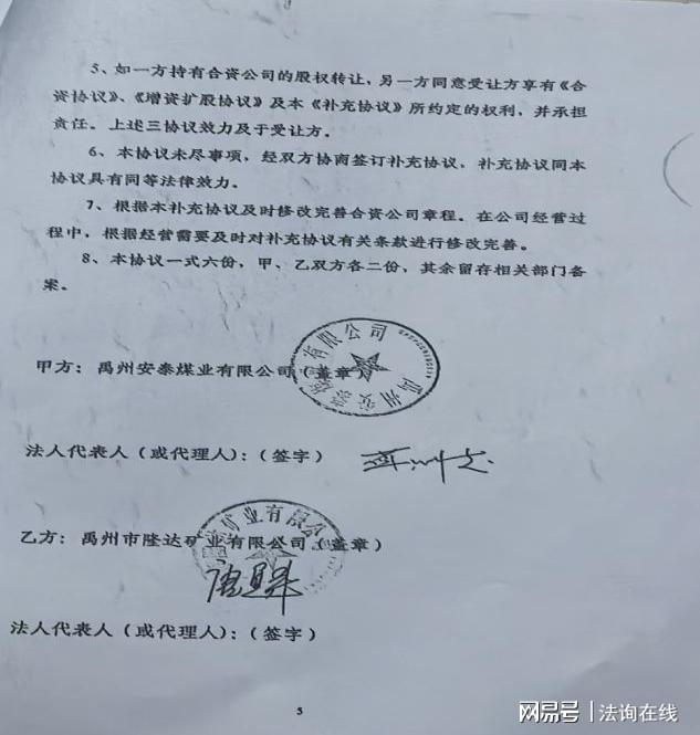 同日,安泰煤业公司和隆达矿业公司也签订了《关于河南平禹新明煤业有限公司补充协议》,明确了前述协议内容及甲方的领导地位。