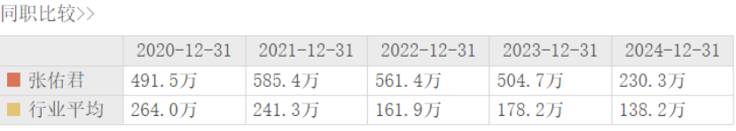 根据披露,2020年-2024年,张佑君年薪分别为491.5万元、585.4万元、561.4万元、504.7万元、230.33万元。