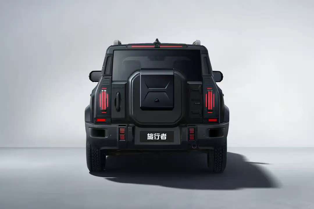 捷途旅行者黑武士长宽高分别为4795/2006/1870(1880)毫米,轴距为2800毫米,隆起的硬朗腰线、外扩散轮拱、侧开式尾门以及外挂式备胎等元素,展现出阳刚野性之美,整车采用黑化风格,包括黑色车身、黑色前格栅、黑色外后视镜壳、黑色轮眉和黑色轮毂等。