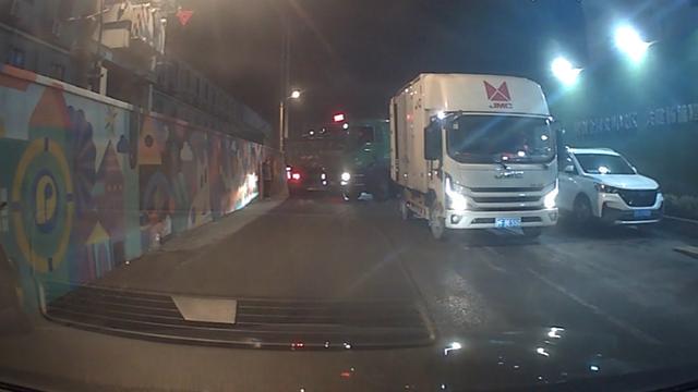 昨晚7时6分,王先生驾车从定海路转入定海港路,刚行驶约50米,就被一辆即将驶出工地的土方车挡住了去路。停在路边的厢式货车驾驶员见状,主动挪车让行。王先生向右打方向避让土方车后,本以为能顺利通过,不料前方又出现“拦路虎”:一辆半挂平板车和一辆大型卡车逆向停在路上,车上无人,将道路完全堵死,仅留出供一人通行的空隙。