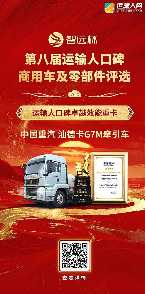 2026年1月16日,运输人网主办的第八届“智远杯”运输人口碑商用车及零部件评选线上颁奖活动隆重举行,中国重汽汕德卡G7M牵引车荣获“运输人口碑高效运输牵引车”奖项。