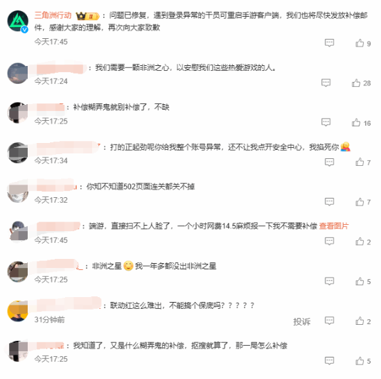 此次故障激起了大量玩家的不满情绪。有玩家表示:“正打得尽兴,突然跳出账号异常?”“人脸识别直接扫不上,一小时网费14.5元,麻烦报销一下,我不需要补偿。”“如果补偿只是走形式,那不如不发。我们不缺这点东西,更希望得到一颗‘非洲之心’,来抚慰我们这些真正热爱游戏的人。”