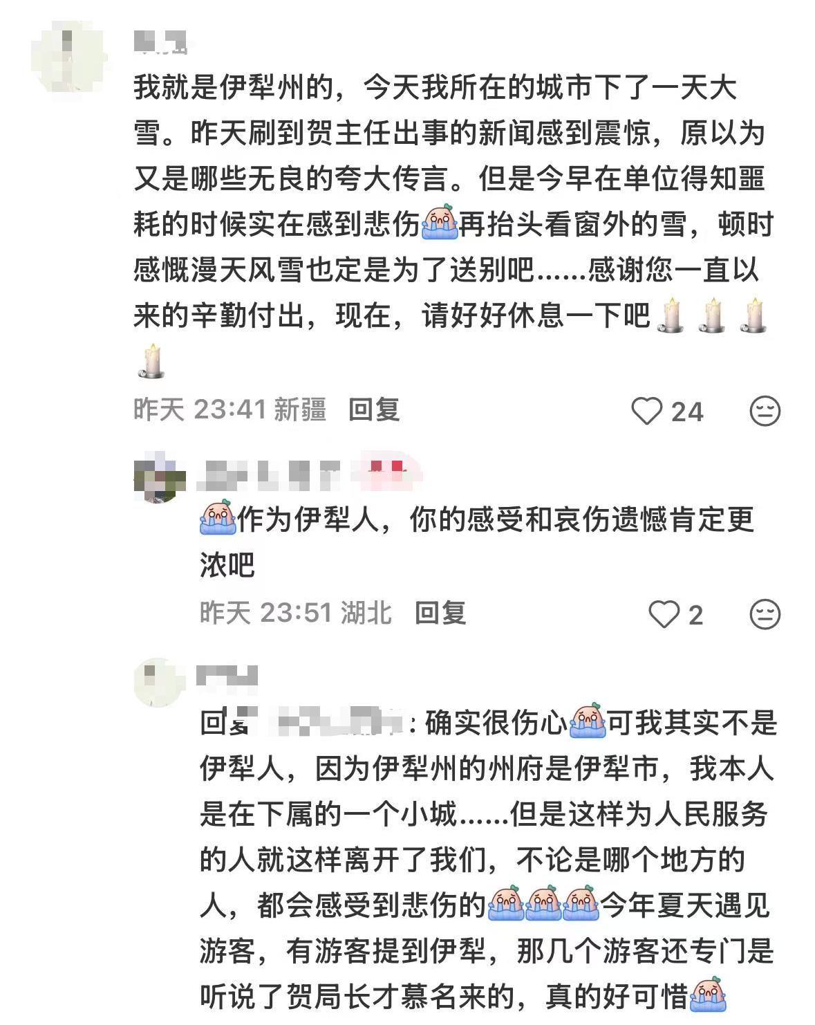 有网民回忆称,贺局长离世当晚,伊犁州突降大雪,雪花纷飞仿佛天地同悲。她说,这场雪像是专为送别这位草原女儿而落。虽非昭苏本地人,但她早就在网络上熟知贺局长的事迹,内心充满敬意。