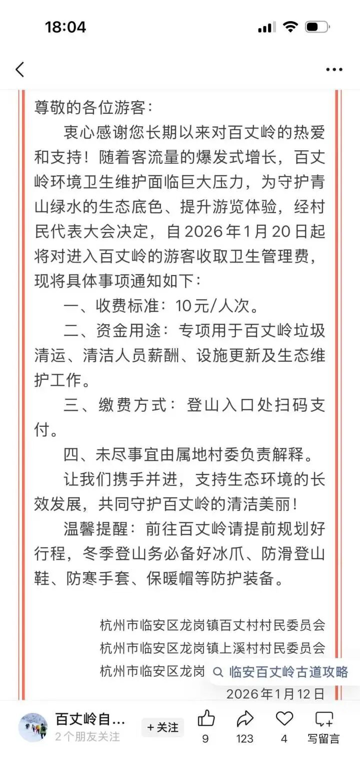 “确实是我们三个村联合发布的。这阵子‘百丈探雪’太火了,来登山游客实在太多,甚至周末一天就有四五千人,在百丈古道上留下的垃圾也不计其数……事实上,在百丈岭清理垃圾的压力远比太子尖大,太子尖登顶只要爬半小时,来回不过1小时;但走一圈百丈岭环线要五六个小时,我们几个村清运垃圾的负担实在太大了!” 盛世杰说,无奈之下他们决定效仿今年1月9日开始收费的太子尖,从1月20日起,对爬百丈岭的游客也收取每人10元的卫生管理费。