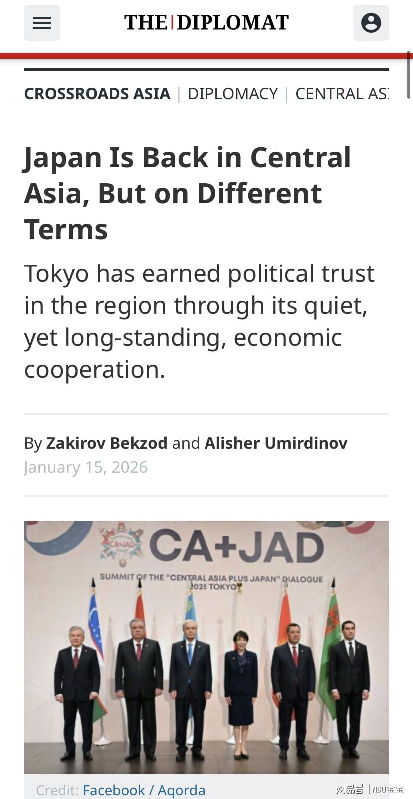 “外交学者”杂志(The Diplomat) 2026年1月16日 日本中亚外交从边缘接触向战略伙伴的转型,12月19-20日,日本主办了首届“中亚+日本”领导人对话峰会(CA+JAD)”。哈萨克斯坦、乌兹别克斯坦、吉尔吉斯斯坦、塔吉克斯坦和土库曼斯坦五国总统应邀出席。此次峰会将2004年启动的“中亚+日本”对话机制升级至领导人层级。标志着日本对中亚的低调外交政策出现转向,该地区正从日本的边缘合作伙伴跃升为战略利益攸关方。日本与中亚国家构建起了多元化合作模式,内容不涉及安全同盟条款,也不设经济前置条件。