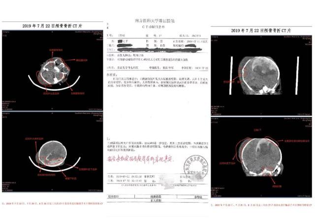 2025年3月,陈先生到珠江医院调取了孩子病历,结果发现许多问题。病历中7月22日、7月29日及8月26日的CT片均显示并报告了头部皮下软组织肿胀,硬膜下出血,蛛网膜下腔出血,脑中线偏移等,“片子上可以明显看到多处颅骨断裂错位,疑似有多发颅骨骨折,但奇怪的是病历和CT报告单上均无骨折内容。”陈先生说,他到过多家医院挂号请专业医生看片子,均得到外伤导致伤情的说法。陈先生录下了到广东某医院神经外科咨询时的视频:医生在查看片子后,明确称系外伤所致,且情况比较严重,有“头皮都肿了,还有各种骨折,跟外伤有关系”的表述。