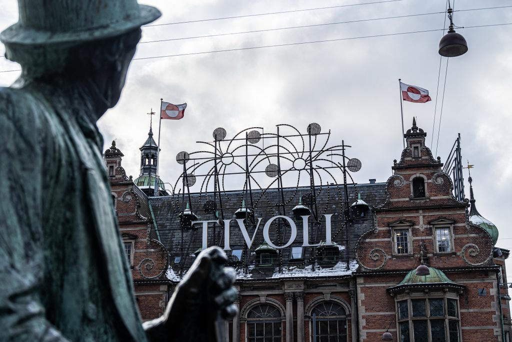1月9日,丹麦哥本哈根,格陵兰岛旗在蒂沃利城堡的安徒生雕像前飘扬。