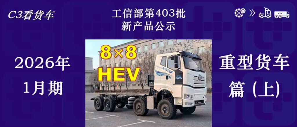 本篇主要内容:12月份重型货车市场“九连红”、全年完美收官,2025全年TOP10盘点、行业再迎风起云涌;2026首批公示87款新品延续繁荣态势、刷新近四年同期水平,一汽解放J6P行业首款8×8柴电混动重卡、福戴银河5M首款LNG电插混牵引;ICE动力两年后终迎回暖,重汽五岳83吨再创石油类GVW Max新高;斯堪尼亚NextEra首款4×2和欧版6×2R,东风柳汽加速产品换代:乘龙HK+H5V;一汽解放鹰驰电动化,三环昊龙-经纬恒润-湖北亿纬“笛卡尔”BEV牵引第二版,北奔重汽2026年度主力V5系列牵引+工程组合;福戴欧曼800度“超大电量”、 世纪 ( 参数 丨 图片 )中远-CDTL“随州造”,神河小满首款4×2及规格系列化、江淮-深向星途扩汉德双电驱桥。