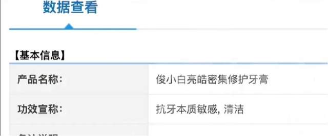据报道,俊小白在网络上以“修护牙釉质再矿化”为卖点,但国家药监局备案显示,该款牙膏的功效宣称仅为“抗牙本质敏感, 清洁”。人体功效评价试验简述亦仅围绕“抗敏感”展开,除产品名称外,无任何“修护”“护釉”类描述。