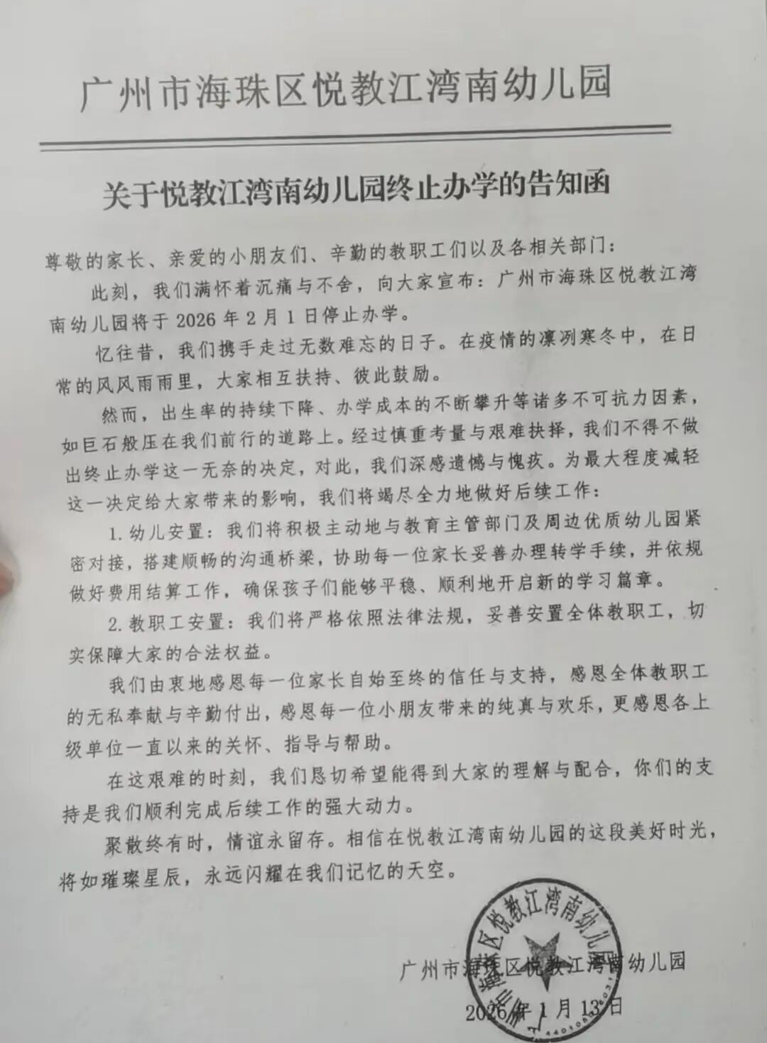 1月13日,海珠区悦教江湾幼儿园发布停办告知函,宣布将于2026年2月1日正式终止办学。"出生率下降、办学成本攀升等不可抗力因素",让这所幼儿园不得不做出"忍痛割爱"的决定。目前,园方已开始与周边优质幼儿园对接,协助家长办理转学手续。
