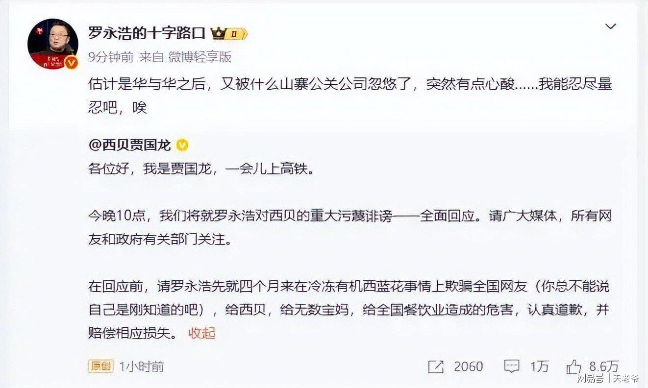 这番言论彻底点燃了贾国龙的怒火,1月16日傍晚很少用社交平台的贾国龙,在找回自己的微博账号后首度发声,直接向罗永浩宣战。