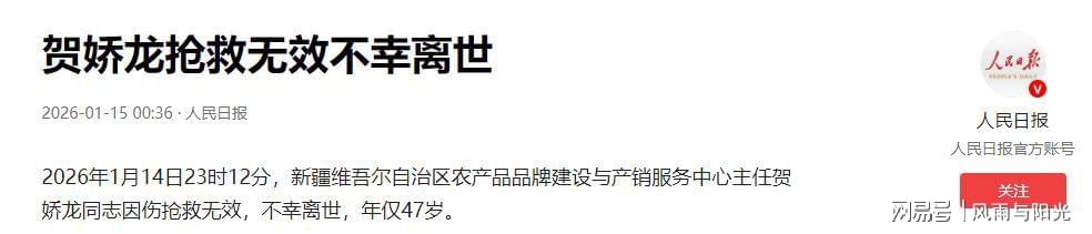 新疆维吾尔自治区农产品品牌建设与产销服务中心主任贺娇龙同志,因意外坠马抢救无效,于1 月14日23时12分不幸离世,年仅47岁。