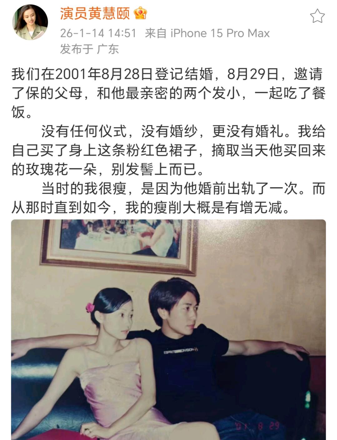 而据黄慧颐在社交账号上的说法,她与保剑锋在2001年8月28日登记结婚,次日与男方的爸爸妈妈、两个好友吃了一顿饭。