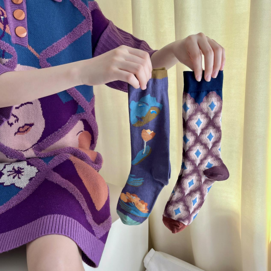 莫奈系列的袜子更多地出现了蓝灰、紫色调,深色穿搭搭配起来,略略亮眼却又不会扎眼,很适合喜欢低调带有设计感的姐妹。