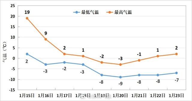 图2 2026年1月15日至23日郑州气温趋势图(单位:℃)