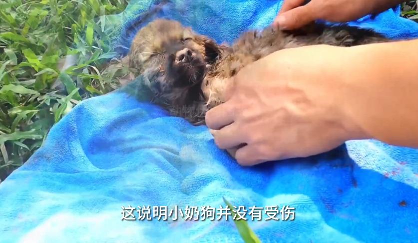 好心小哥将小奶狗抱进了草丛中,然后小奶狗喂了一点点的水。小奶狗喝了点水后,似乎恢复了一些的活力。