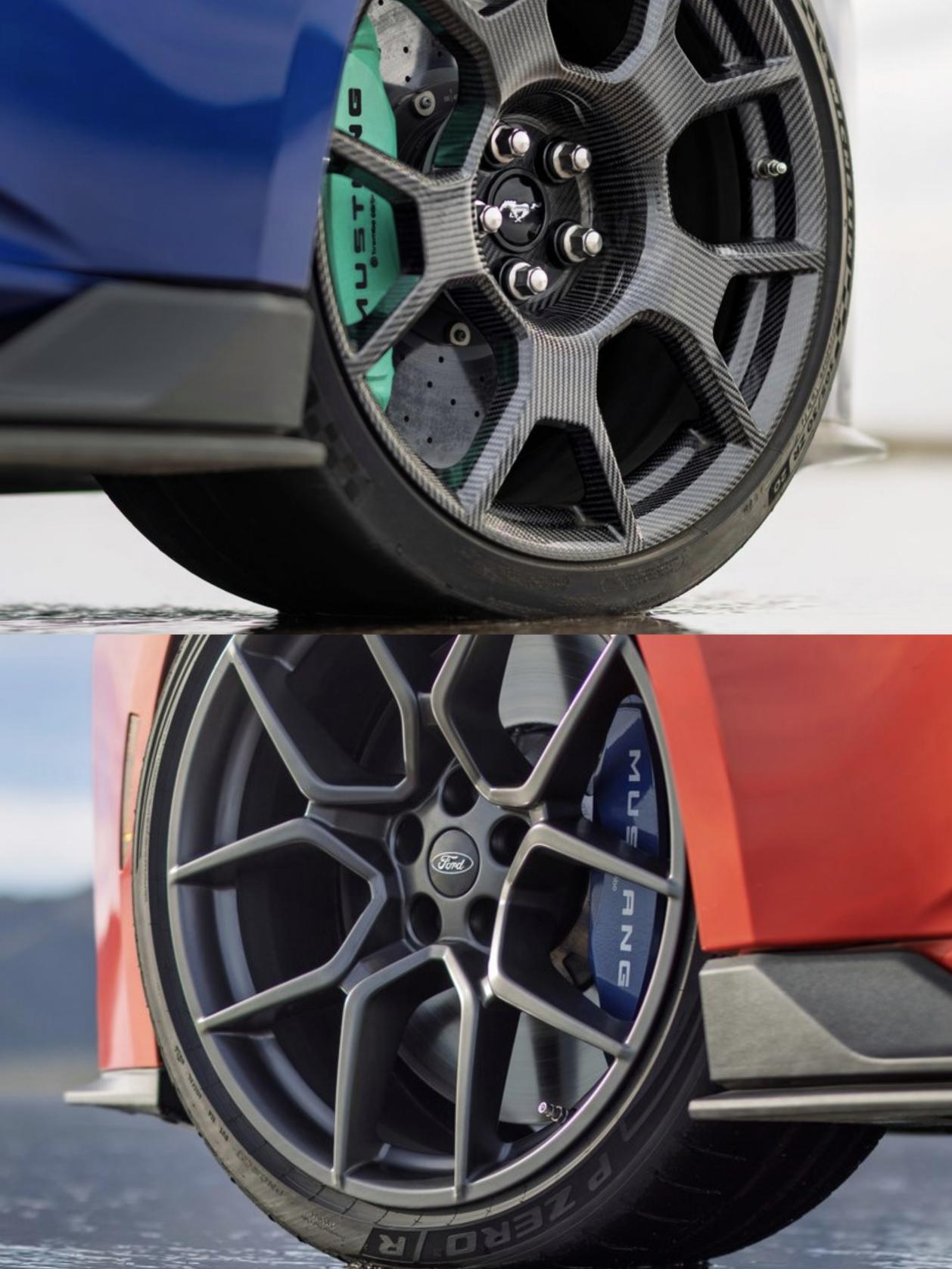 Track Pack配备20寸碳纤维轮毂搭配米其林Pilot Sport Cup2 R轮胎,前305/30 R20,后315,还有源自GTD上的碳陶制动系统。并且Track Pack性能包还让SC整车减重了68kg,而下压力相比Dark Horse却增加了一倍。
