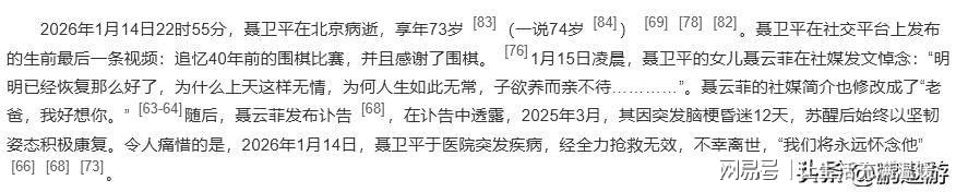 而说到底聂卫平离世这件事最为悲伤的还是家人1月15日聂云菲直接在自己的社交平台上发布了悼念。