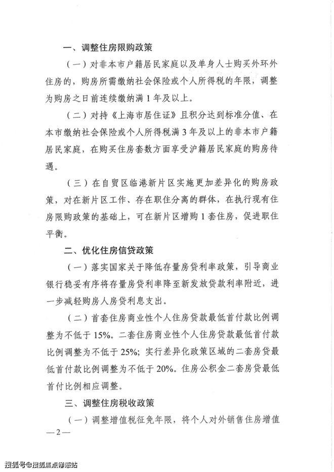 一是缩短非沪籍居民购买外环外住房所需缴纳社保或个税年限。对非本市户籍居民家庭以及单身人士购买外环外住房的,购房所需缴纳社会保险或个人所得税的年限,从“购房之日前连续缴纳满3年及以上”调减为“购房之日前连续缴纳满1年及以上”。二是提升持《上海市居住证》且积分达到标准分值群体的购房待遇。对持《上海市居住证》且积分达到标准分值、在本市缴纳社会保险或个人所得税满3年及以上的非本市户籍居民家庭,在购买住房套数方面享受沪籍居民家庭的购房待遇。三是在自贸区临港新片区实施更加差异化的购房政策。对在新片区工作、存在职住分离的群体,在执行现有住房限购政策的基础上,可在新片区增购1套住房,促进职住平衡。