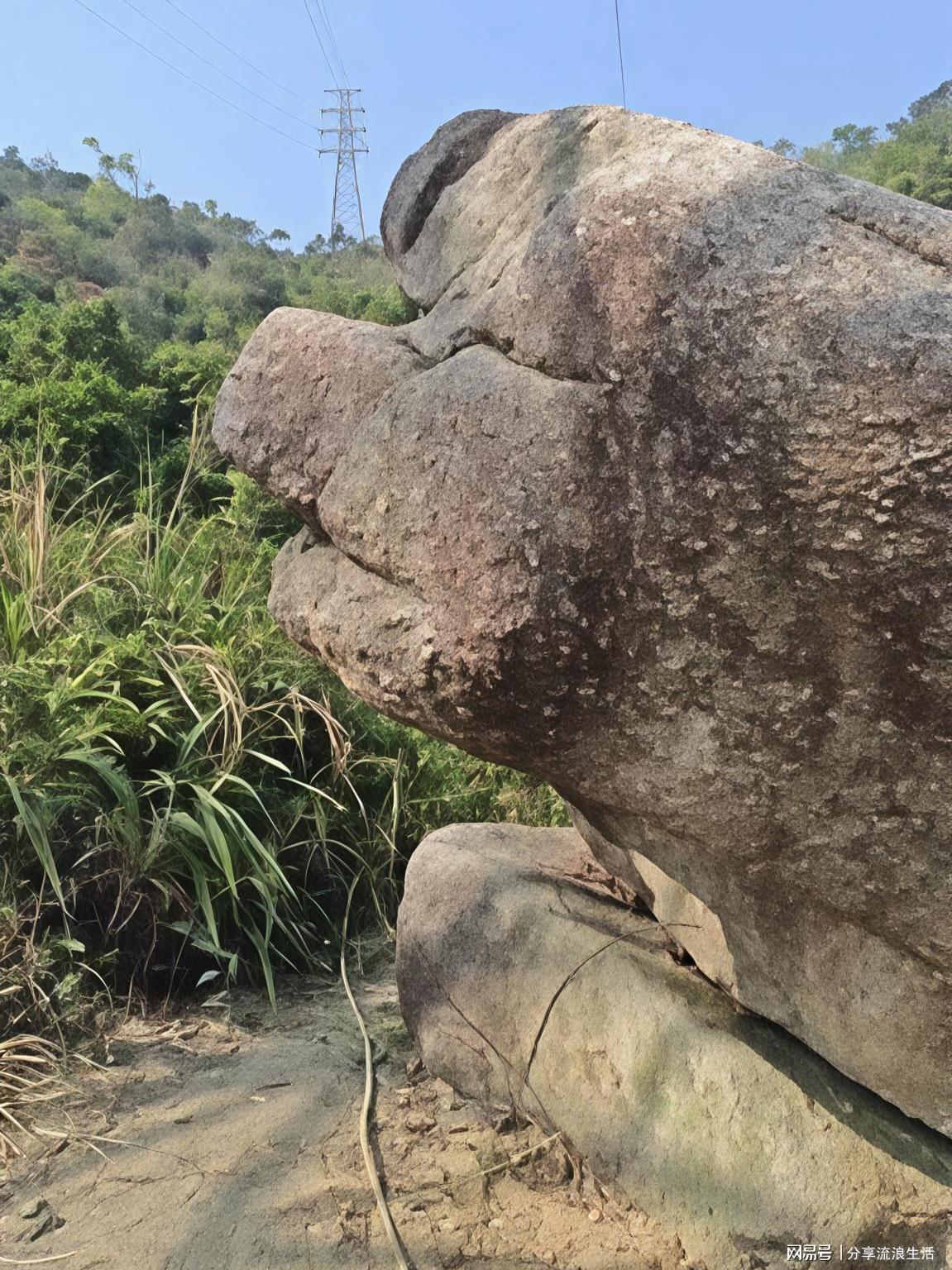 山路边蹲着一块巨石,灰褐色的石面布满斑驳纹路,像被岁月的手掌揉皱的皮革。石棱凸起处蹭着青苔的痕迹,边缘被阳光晒得发白,与周围疯长的绿草相映成趣。远处的高压电塔刺破蓝天,电线如细银丝般延伸进山林,为这片原始的野趣添了丝现代的痕迹。
