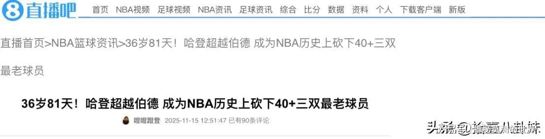 第四节最后时刻,哈登突然爆发,突破得2分、再突破又得2分、抢断成功再造罚篮,个人连拿8分,硬生生把比分扳平。绝杀球没进,比赛拖入加时,但这时候的哈登已经进入那种无人能挡的状态,中距离一个接一个往里灌,猛龙根本防不住。最终快船赢了,拿下五连胜,哈登全场打了51分钟,创下生涯常规赛出场时间新高,36岁81天的年纪,他成了NBA历史上最老的40+三双球员,打破了伯德保持33年的纪录。