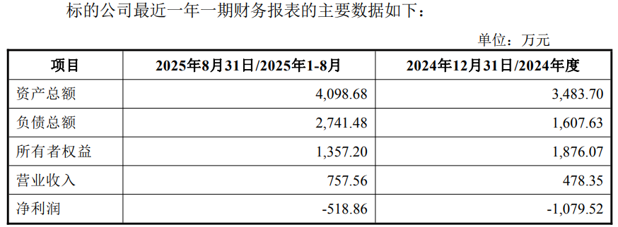 读创财经注意到,最近一年一期财务报表(见下表)显示,标的公司2024年营收仅478.35万元、净亏损1079.52万元;2025年前8个月,标的公司营收757.56万元,亏损518.86万元。公司所有者权益自2024年末的1876万元缩水至2025年8月末的1357万元。值得注意的是,与近年来A股多个并购案例不同的是,本次交易未设置业绩承诺及补偿条款。