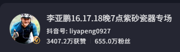 目前,李亚鹏账号粉丝655万,据他个人账号描述,从1月16日到18日,每晚7点会直播紫砂瓷器专场。