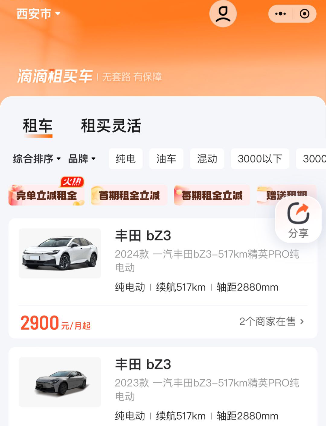 随后系统会跳转进入【滴滴租买车】小程序;里面会有一堆可以租的车,电车、油车都有,像 比亚迪e5 ( 参数 丨 图片 )、秦PLUS、 轩逸 这些比较常见。每辆车都会标明租金、押金、租期。