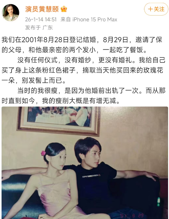 2001年8月,俩人登记结婚,没有任何仪式,仅仅是黄慧颐花钱给自己买了条粉红色裙子,再摘了朵玫瑰花当发簪↓