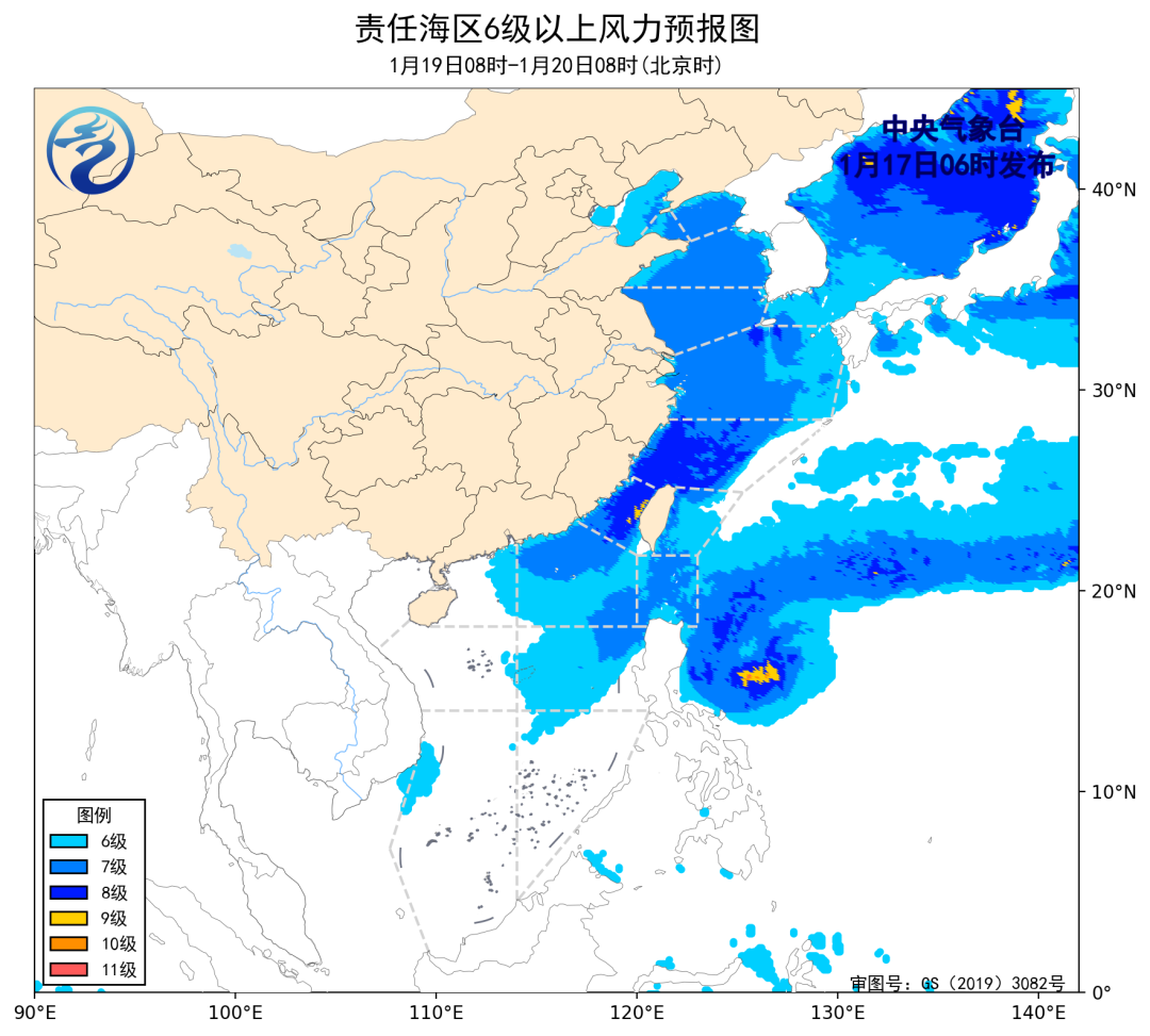 19日08时至20日08时,东海南部海域、台湾海峡将有6~8级、阵风9级的东北风,渤海海峡、黄海大部海域、东海北部海域、巴士海峡、南海东北部海域将有5~7级、阵风8级的偏北到东北风,渤海、台湾以东洋面、南海中东部海域将有5~6级、阵风7级的偏北到东北风,南海西北部海域将有4~6级、阵风7级的偏东风。