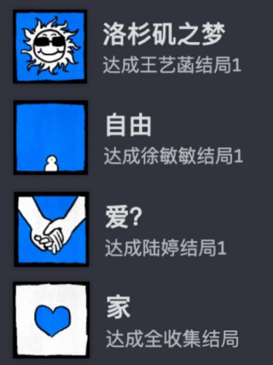 蓝色并不贯穿每一段叙事,而是零散地分布在少数结局与成就图标之中,既不改变游戏的整体基调,也无法覆盖黑白世界的压迫感。王艺菡线中出现的蓝天,首先指向的是地理层面的跨越。相较于小城空间的封闭与窒息,异国的天空与海滩构成了一种对远方的想象。在蓝色的天空下,赵颖第一次获得伸展身体与意识的可能。蓝色,成为一个离开既有空间的标记。徐敏敏线的true ending中,蓝色则以更加抽象的形式出现。成就图标中那片几乎吞没人影的纯蓝,更像是一种身份状态的悬置。赵颖改姓、脱离旧家庭、建立新生活秩序,这些变化并未在叙事中被充分展开,而是被压缩进一块颜色之中,作为结果被展示。