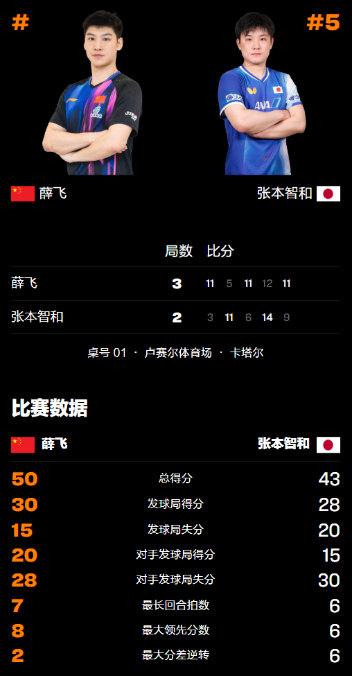 比赛开始后,薛飞迅速发动,很快又在首局取得8-3领先的优势,打出了直拍运动员的台内控制与快速起板优势,很快便迅速压制张本智和并以11-3轻松取胜,基本做到了扬长避短,让日本小将在场上显得非常被动,也没有吼叫起来。