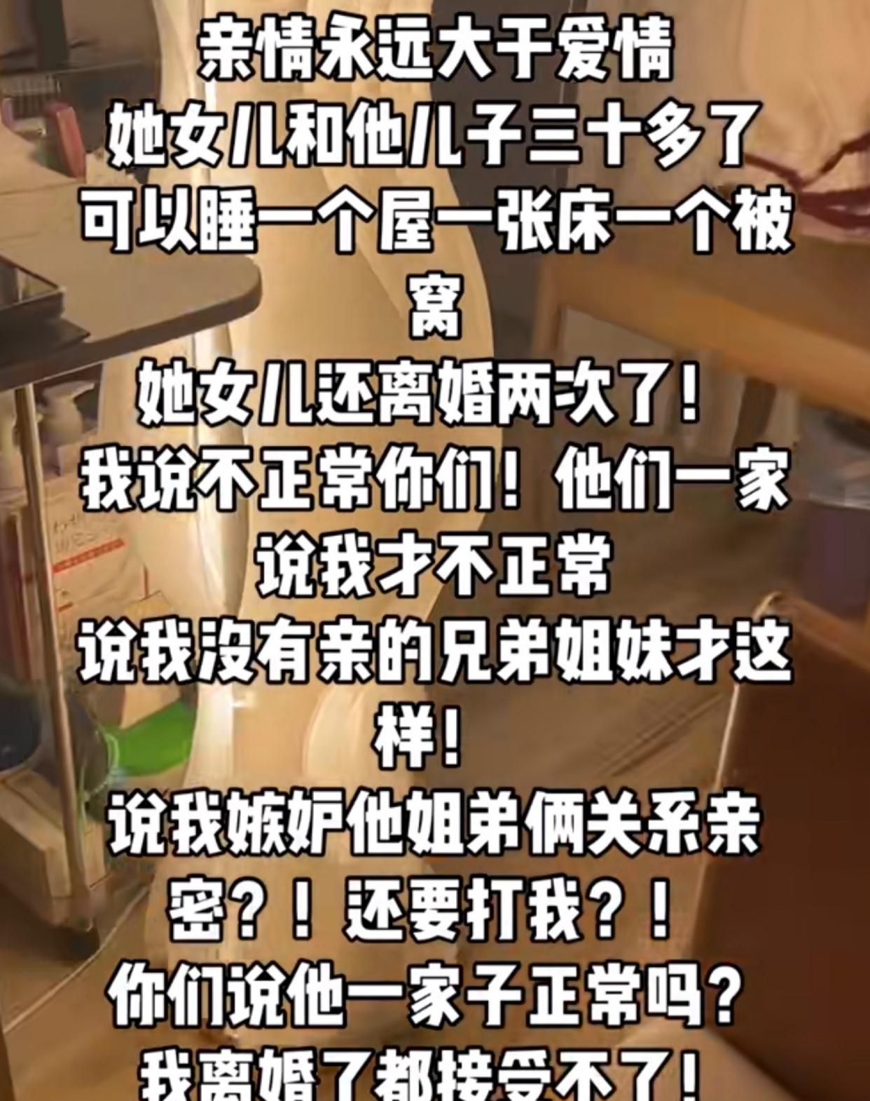 她忍无可忍,告诉了婆婆。结果婆婆更奇葩,不仅不恼,还偏袒女儿,直言:亲情大于爱情,她女儿和儿子睡一个屋一张床没问题!