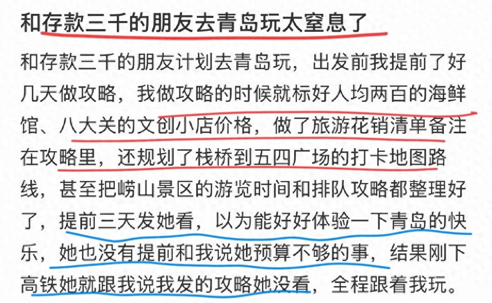 最近在网上看到一位博主发文吐槽,说她和一个存款只有3000块钱的朋友去青岛玩,但整个过程实在是太让人窒息了。
