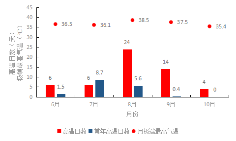 2025年高温程度强、影响范围广、持续时间长。高温日(日最高气温≥35℃)54天,较常年偏多37.7天,位居历史第一,日极端最高气温38.5℃(8月9日)。北仑国家基本气象站38℃以上高温日数4天,连续21天(8月19日至9月8日)日最高气温超过35℃,首次在10月出现高温日。