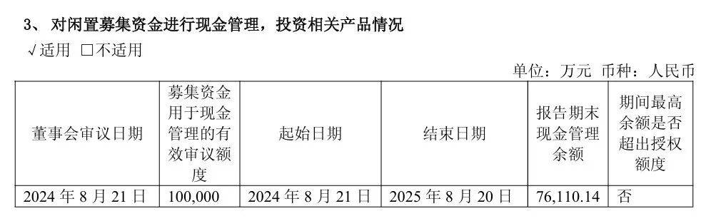 为提高闲置资金使用效率,公司于2024年8月召开董事会,审议通过《关于使用部分闲置募集资金进行现金管理的议案》,获批使用不超过10亿元的暂时闲置募集资金开展现金管理业务。根据披露数据,截至2025年6月末,公司实际投入现金管理的闲置募集资金金额约为7.61亿元。