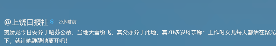 贺娇龙下葬后,其70多岁的母亲首次发声,称工作时女儿每天都活在聚光灯下,就让她静静的离开吧。很显然,老人家希望贺娇龙的葬礼可以低调一些。