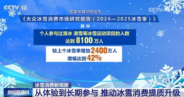 国家体育总局发布的《大众冰雪消费市场研究报告(2024—2025冰雪季)》显示,2024—2025冰雪季,我国冰雪运动参与人数达到2.92亿人。这其中,个人参与过滑冰、滑雪等冰雪运动项目的人数达到8100万人,较上个冰雪季增加2400万人,增幅达到了42%。这也意味着我国冰雪运动正从一次性的体验向长期参与的运动爱好转变。