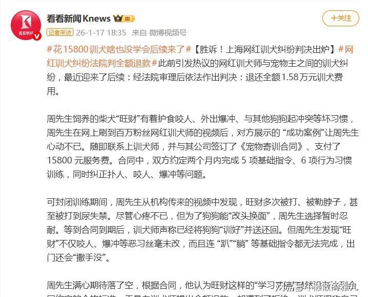 这场天价训犬纠纷,看似是宠物主与服务机构之间的合同争议,实则撕开了宠物训练行业缺乏标准、收费混乱、方法粗暴的一角。当网红的光环遇上白纸黑字的合同,当“情感联结”的承诺变成“暴力矫正”的现实,消费者付出的不仅是金钱,还有对爱宠身心健康的担忧。法院的判决,不仅给消费者撑了腰,也给整个行业敲了一记警钟:训练宠物,光靠“网红”流量和“话术”包装远远不够,专业、人道与契约精神,才是立身之本。至于“旺财”到底该听谁的,法律已经给出了明确的答案。