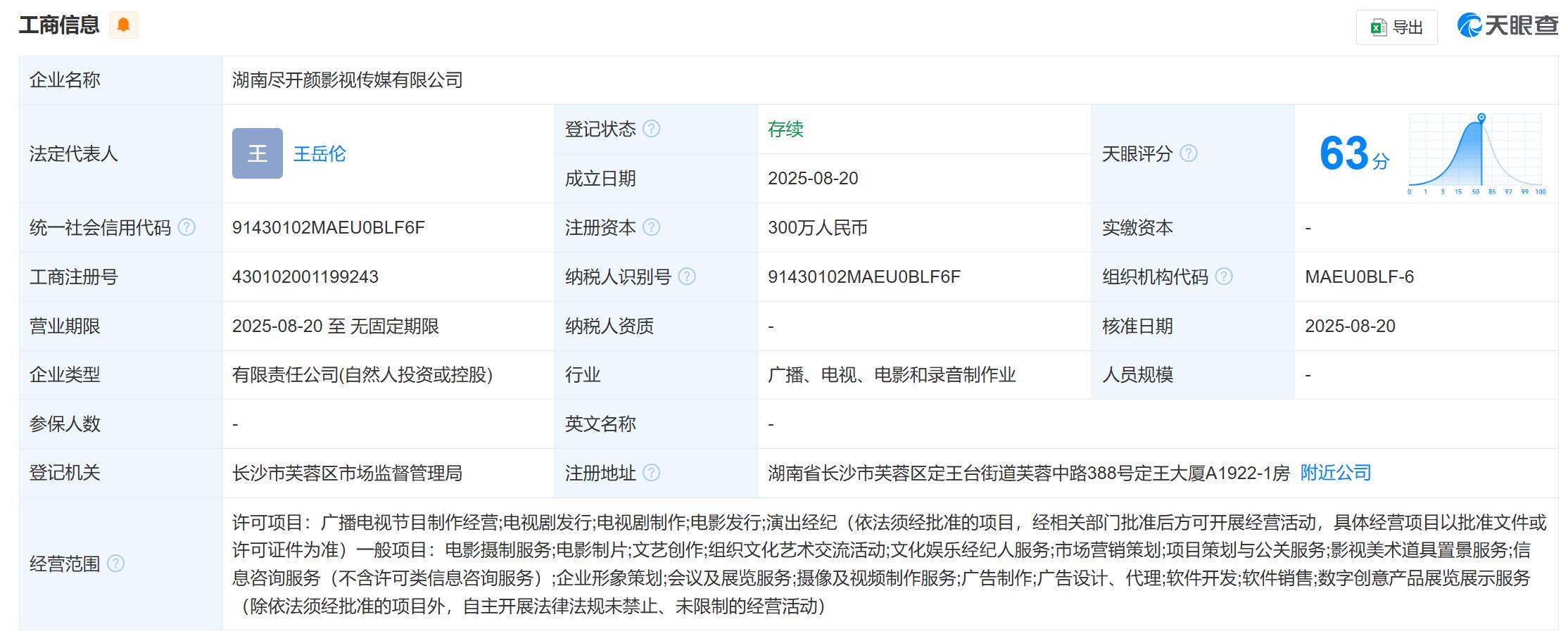 颇为讽刺的是,她与前夫王岳伦在2025年8月刚刚联手注册了湖南尽开颜影视传媒公司,注册资本300万,李湘持股高达99%。