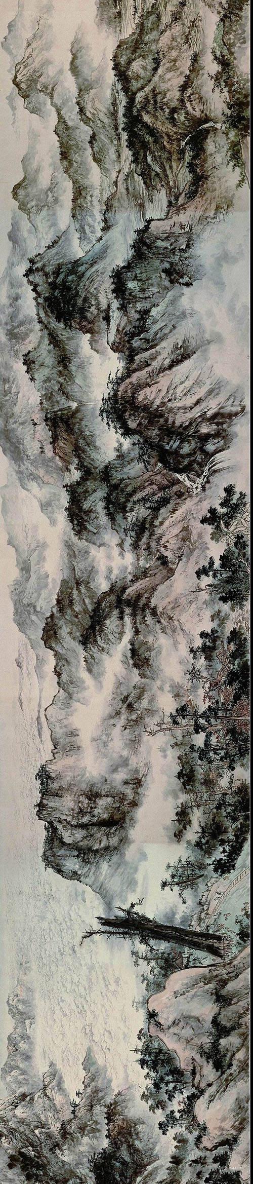 《宝岛长春图》是由张大千开第一笔,若干画家共同努力完成的。此卷高约2 尺,长达215 尺,全图从构思、构图到绘制、完成,张大千都参与其中。