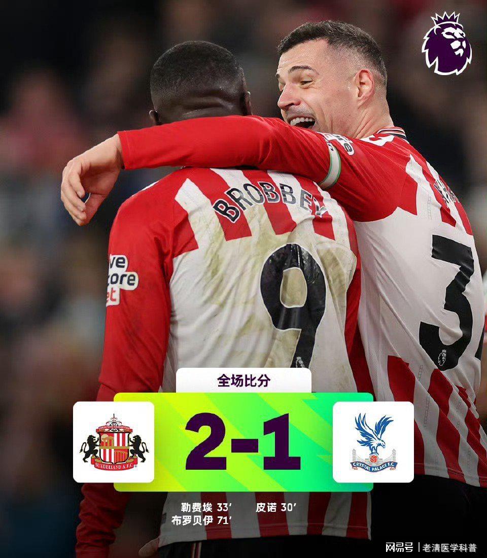 下半场比赛进行到第71分钟,布罗贝伊禁区内抢点捅射破门,休姆反击中劲射击中门楣飞出,全场比赛结束,桑德兰2-1击败水晶宫拿到3分,终于是找回了胜利的感觉。