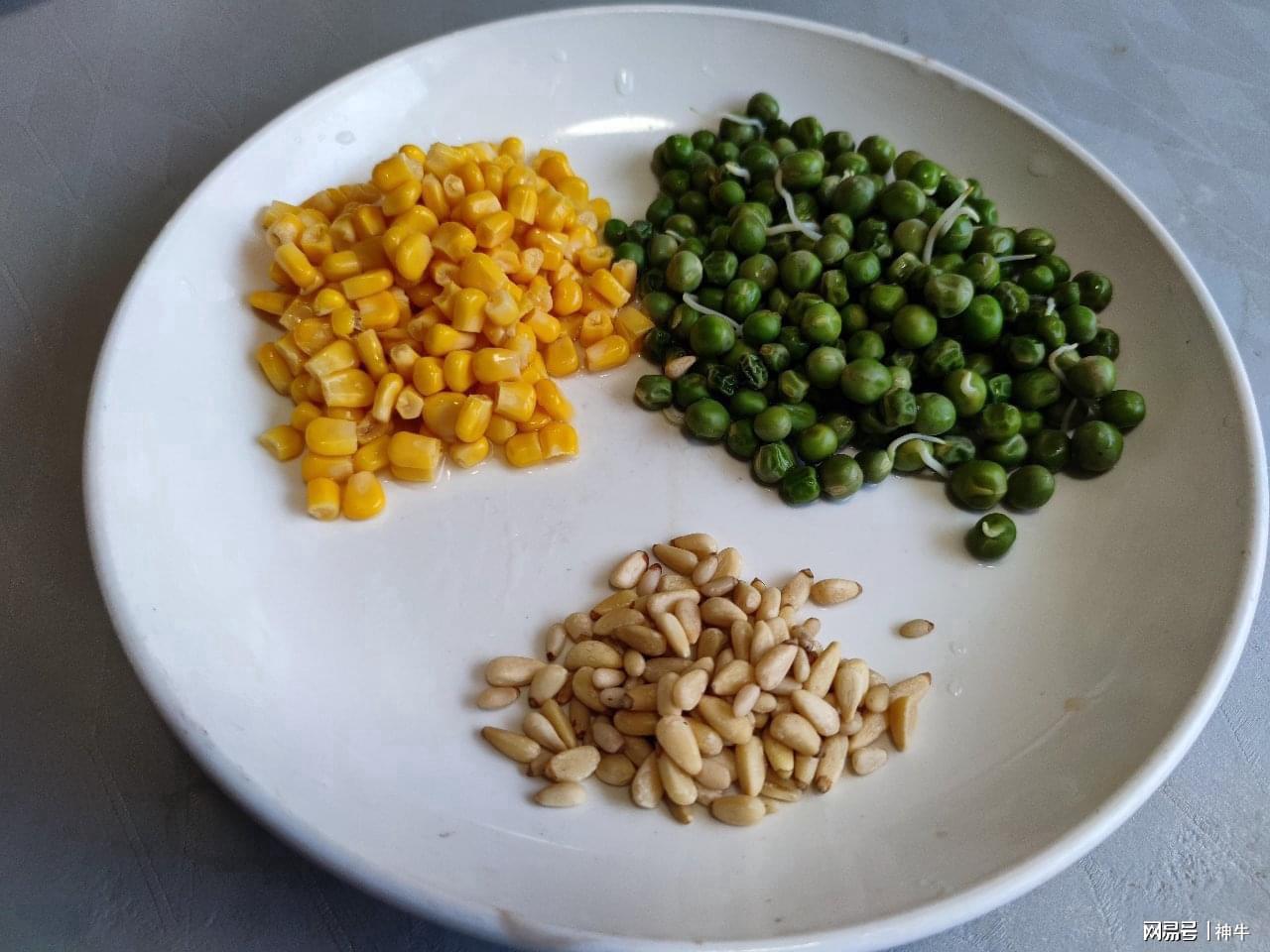 1.青豌豆泡发后漂洗干净焯水备用,甜玉米粒罐头去除里面的汁水,松仁入锅中炸香后捞出控油备用。