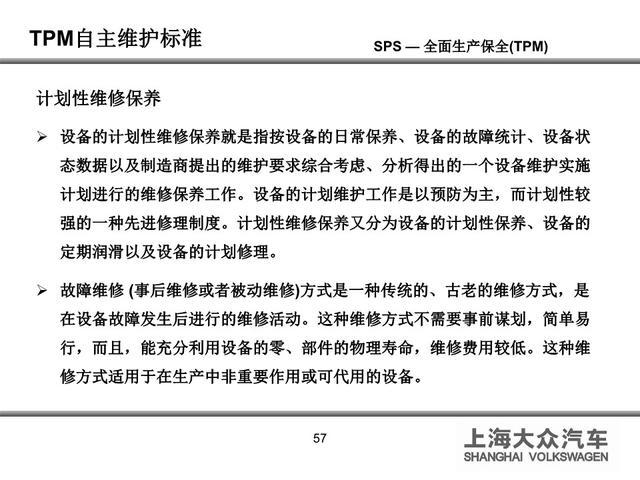 - SPS:上海大众标准生产系统(Standard Production System),TPM 是 SPS 的核心支柱之一,与标准化作业、6S、目视化、持续改进等模块协同推进。